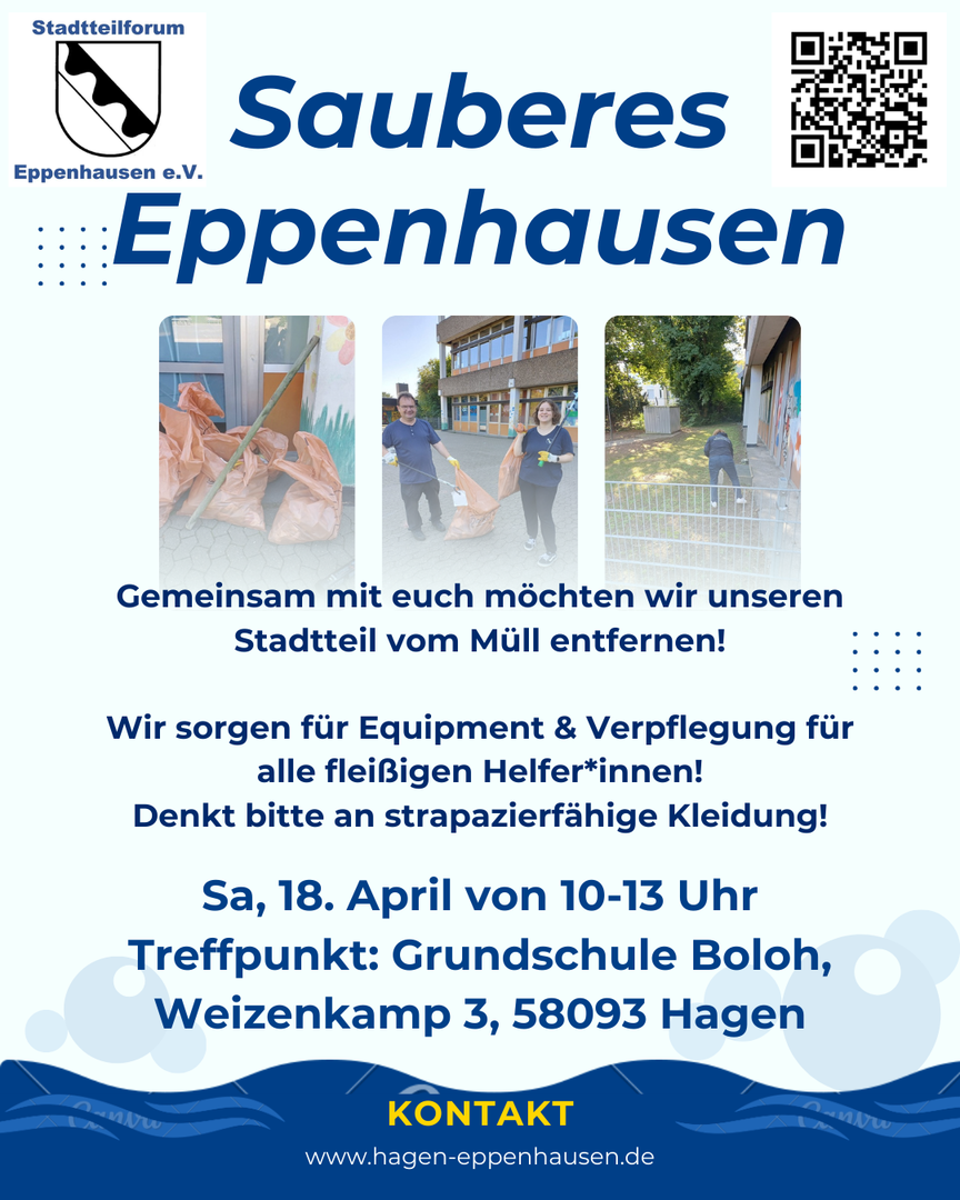 Wer sich für Umweltschutz und Nachhaltigkeit mit engagieren möchte, kann am Samstag, den 18. April ab 10 Uhr an der Müllsammel-Aktion „Sauberes Eppenhausen“ teilnehmen. Zudem sind noch freiwillige Beiträge beim Stadtteilfest in Eppenhausen willkommen. Wer mit einem kulturellen Angebot die Stadtteilgemeinschaft mit bereichern möchte kann sich den 20. Juni von 13 Uhr bis 18 Uhr einplanen. Anfragen können an den 1. Vorsitzenden Hinrich Riemann gerichtet werden, telefonisch unter 0172 / 58 40 347 oder per E-Mail an info@hagen-eppenhausen.de. Aktuelle Informationen zur Stadtteilarbeit gibt es im „Eppenhauser Stadtteilfenster“, einem Schaukasten neben der Bushaltestelle „Haßleyer Str., sowie auf der Internetseite unter www.hagen-eppenhausen.de.
