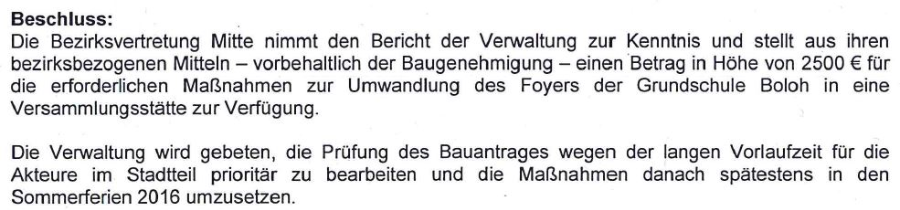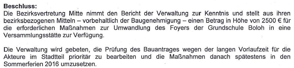Die Politik, die BV-Mitte, hat am 23.02.2016 nachstehenden Beschluss gefasst, wonach die Verwaltung um prioritäre Bearbeitung gebeten wurde.