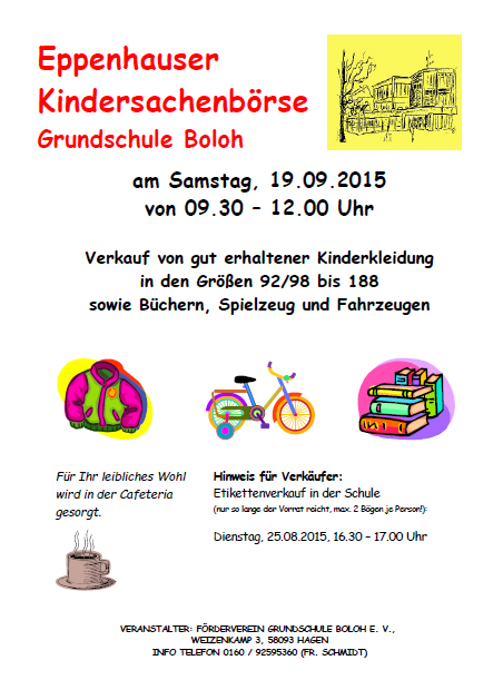 Der Förderverein Grundschule Boloh e. V. veranstaltet am Samstag, 19.09.2015 in der Zeit von 9:30 bis 12:00 Uhr eine große gemeinnützige Kindersachenbörse in der Grundschule Boloh, Weizenkamp