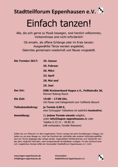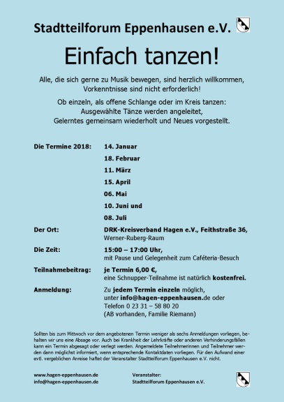 Am kommenden Sonntag, 08.11. kann von 15 bis 17 Uhr getanzt werden! Das Stadtteilforum Eppenhausen e.V. lädt zu einem offenen Tanztreff beim DRK-Kreisverband Hagen, Feithstraße